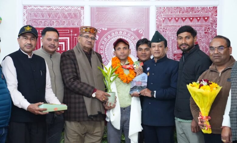 देहरादून, 24 दिसम्बर। सैनिक कल्याण मंत्री गणेश जोशी ने आज अपने शासकीय आवास पर जनपद चमोली के देवाल ब्लॉक स्थित मुन्दोली गांव के पूर्व सैनिक नायक कलम सिंह बिष्ट (50 वर्ष) को ओमान में आयोजित 120 किलोमीटर अल्ट्रा ट्रेल रन प्रतियोगिता में प्रथम स्थान प्राप्त करने पर सम्मानित किया। मंत्री ने उन्हें शॉल ओढ़ाकर एवं पौधा भेंट कर सम्मान दिया तथा बधाई एवं शुभकामनाएं देते हुए उनका उत्साहवर्धन किया। सैनिक कल्याण मंत्री गणेश जोशी ने कहा कि पूर्व सैनिक कलम सिंह बिष्ट की यह उपलब्धि न केवल उत्तराखंड बल्कि पूरे देश के लिए गर्व की बात है। उन्होंने कहा कि पूर्व सैनिकों की प्रतिभा, अनुशासन और संकल्प देश का नाम अंतरराष्ट्रीय स्तर पर रोशन कर रहा है। उल्लेखनीय है कि ओमान में 11 से 13 दिसम्बर 2025 तक आयोजित इस अंतरराष्ट्रीय अल्ट्रा ट्रेल रन प्रतियोगिता में 68 देशों के धावकों ने प्रतिभाग किया था। इस कठिन प्रतियोगिता में 120 किलोमीटर की चुनौतीपूर्ण दौड़ पूरी कर पूर्व सैनिक कलम सिंह बिष्ट ने भारत का प्रतिनिधित्व करते हुए प्रथम स्थान हासिल किया। इस अवसर पर रिटायर्ड कर्नल ईश्वर सिंह फर्स्वाण, कैप्टन विशन सिंह दत्त कुनियाल, हवलदार खिलाफ सिंह बिष्ट, सूबेदार नरेंद्र सिंह, भरत सिंह राणा, धर्म सिंह, सुंदर सिंह, प्रधान दर्शन सिंह, कुशाल शाह, रघुवीर सिंह, कैप्टन वीरेंद्र सिंह, कृष्णा सिंह, सुंदर सिंह, हीरा फर्स्वाण सहित कई लोग उपस्थित रहे।